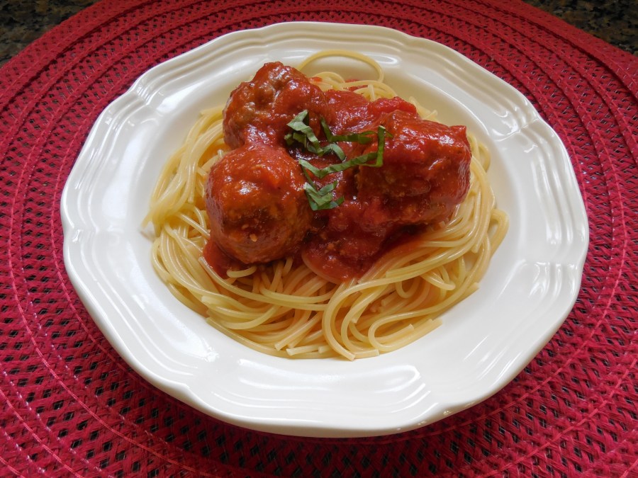 You can make a simple and delicious tomato sauce from scratch in no time at all, or as I have learned, you can make a complicated and oniony sauce from scratch over an entire three-day weekend. For meatballs, I opt for cans and jars. (One of each, plus a can of diced tomatoes for homemade-looking chunkiness. Canned sauce is too sweet, jarred sauce is too thick and acidy – together they work quite well.) Plus for forty eight meatballs, you’re going to need a lot of sauce. Carefully remove the meatballs from the foil – use tongs and twist so they don’t fall apart or rip the foil. (If the foil doesn’t rip, the pans don’t have to be washed too enthusiastically, provided you can keep small animals off them.) Throw in another half cup of grated parmesan for depth and texture. Throw in a parmesan rind – this is a fairly new trick I learned that gives incredible flavor to any tomato sauce. Chop some fresh herbs from your garden (ha ha). Again the possibilities are endless. The kitchen is a playground – have fun in it.