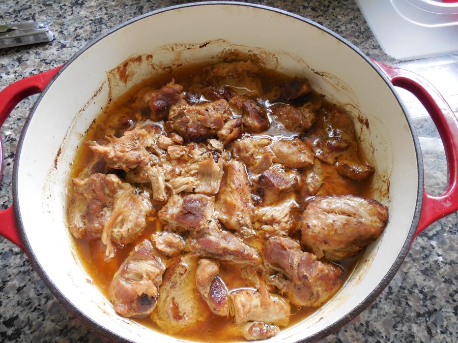 Throw it all in a pot, and fill up with water until it just barely doesn’t cover the top of the meat. Put this all in the oven at 300 degrees, and go out into the world and live your life. Actually don’t – you should never leave the house while the stove or oven is on (or washing machine, TV, hair dryer, etc.) But that’s pretty much the bulk of this preparation – let it cook slowly for a longlonglong time. Once the pork is cooked through (2 to 3 hours) you can turn the oven off, let it sit in there, and go shopping or whatever. Turn the oven back on when you come home. (Note: Do not rely on me for food safety advice. Meat probably shouldn’t sit around cooling in an oven and generating bacteria. BUT I have not died from pork. Yet.) This particular pot cooked for around 5 hours when I turned my attention back to it.