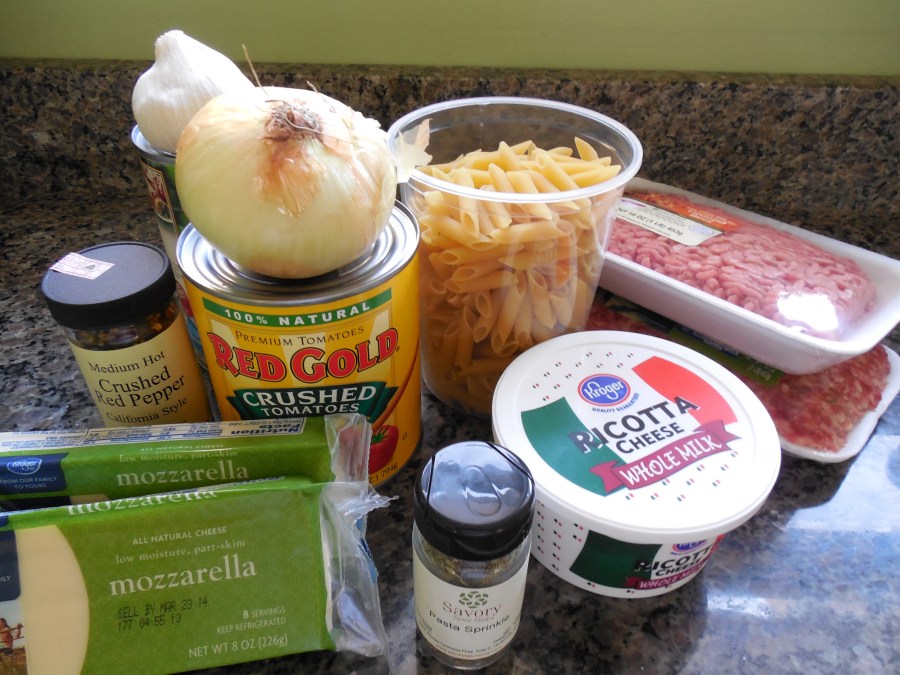 First I’ll pick a bone: my grocery doesn’t sell ziti. I have about 6 choices in noodle shapes, and the closest I can get is penne. For the purposes of this recipe, we will refer to it as ziti. I also have a few half-empty boxes of real ziti, rigatoni, and mostaccioli that I will probably throw in as well, for no other reason than to clear out some cabinet space.