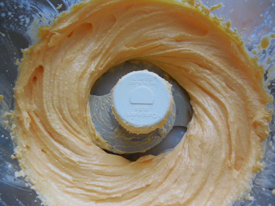 Then I grate the cheese in my food processor, and add the powdered milk, salt, and cream of tartar. Sprinkle the gelatin over one tablespoon of cold water and let it gel for about five minutes. Then heat your milk to just when it starts to boil. Acting quickly, whisk the gelatin into the milk, and pour into the running food processor before it can cool. This creates an unhealthy amount of stress in my life, but thankfully only lasts about ten minutes. Let it whir – the hot milk melts the cheese and you can watch it get creamy looking. This is fun, as I can watch and see that it’s working – I’m doing it, I’m doing it!