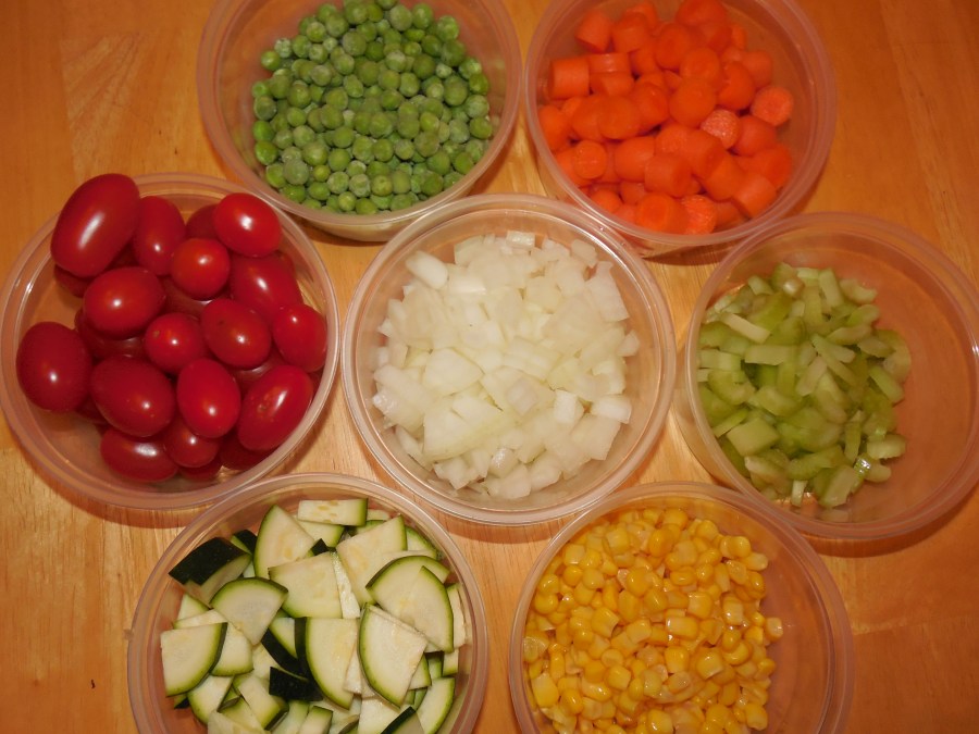 Add the rest – a big jug of vegetable juice, the other vegetables (here it’s corn, peas, and zucchini, since I love zucchini and put it in everything). Then the glorious beef juice! Also cherry tomatoes – I was asked specifically to not add tomatoes by two co-workers who knew of my nefarious soup-making plans. I compromise. This way they’re easy to avoid, and actually delicious – they pop open hotly, flooding your mouth with tomato goodness.