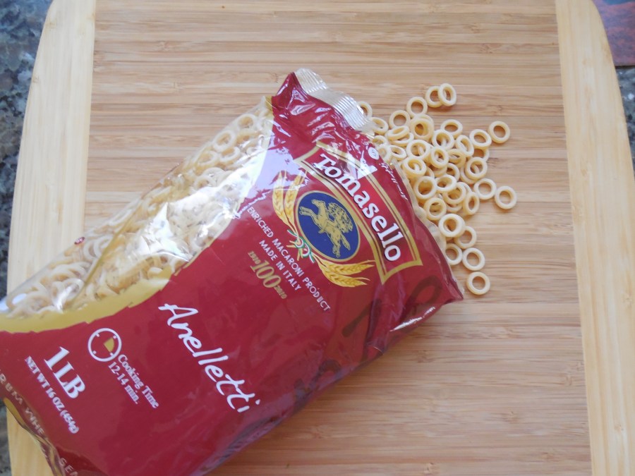 But let’s be fancy shall we? Today I’m making Anelletti con Polpettine. Ring-shaped noodles with tiny meatballs (polpettine). The ring-shaped noodles are hard to find – while this isn’t exactly the most original idea (Google it – there are dozens.), most of those un-enterprising types use ditalini, shells, or some other decidedly non-SpaghettiO-shaped noodle, and I’m all about making things more difficult, so I have to order Anelletti online from Amazon. No inexpensive, readily available noodles for me!