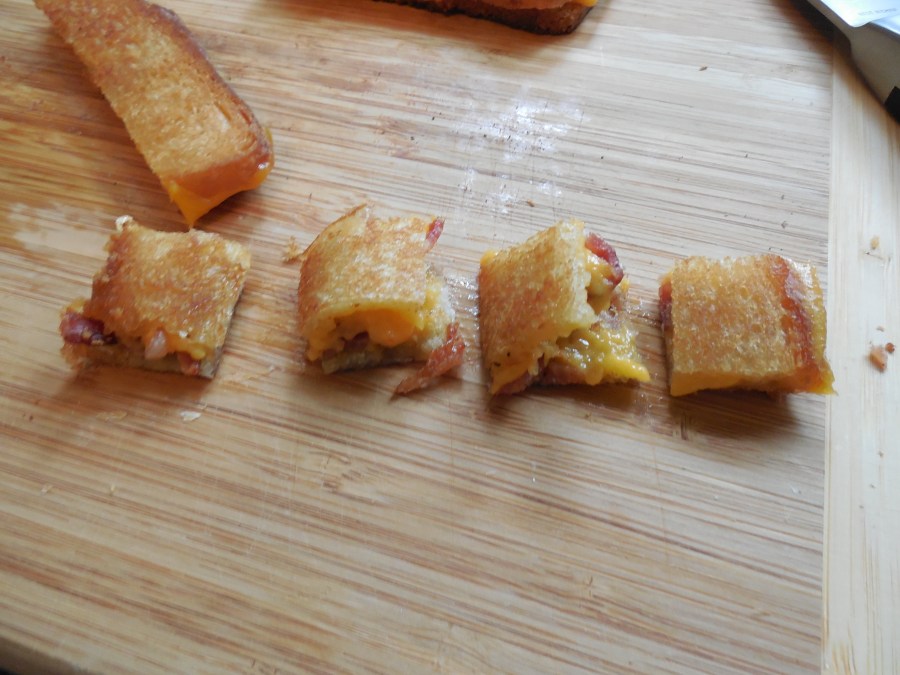 Well of course you start by making grilled cheese. Almost everyone knows how to do this already, so I won’t get into the details. I do nothing special or different with it, besides use cheddar cheese and sprinkle chopped bacon over it because – protein. I’m also using very thinly sliced bread so the croutons don’t end up too big.