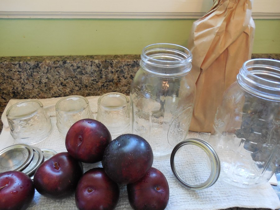 Quarter the plums and stick them into either a half-gallon or two one-quart mason jars. I’m using quart jars, since that’s what they had at Kroger. One pound of plums per jar: