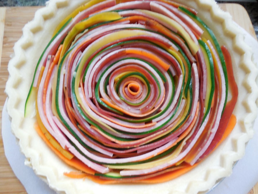 Okay. Excuses over. I’ll just write some stuff. After all the crap I’ve been through (put myself through) I needed a win. I wanted something pretty. And Trader Joe’s had bags of different colored carrots I’ve been searching for forever. Once upon a time I saw another blog (whose name escapes me – apologies to the writer) where the most beautiful tart was made of thin ribbons of vegetables rolled into a giant spiral with strips of ham and filled with custard to be baked like a quiche. Or a tart. Whatever. I’ve never made anything quite so lovely, so instead of my usual slab of meat or bucket of sawce (as a food-friend calls it), I thought I’d give it a try.