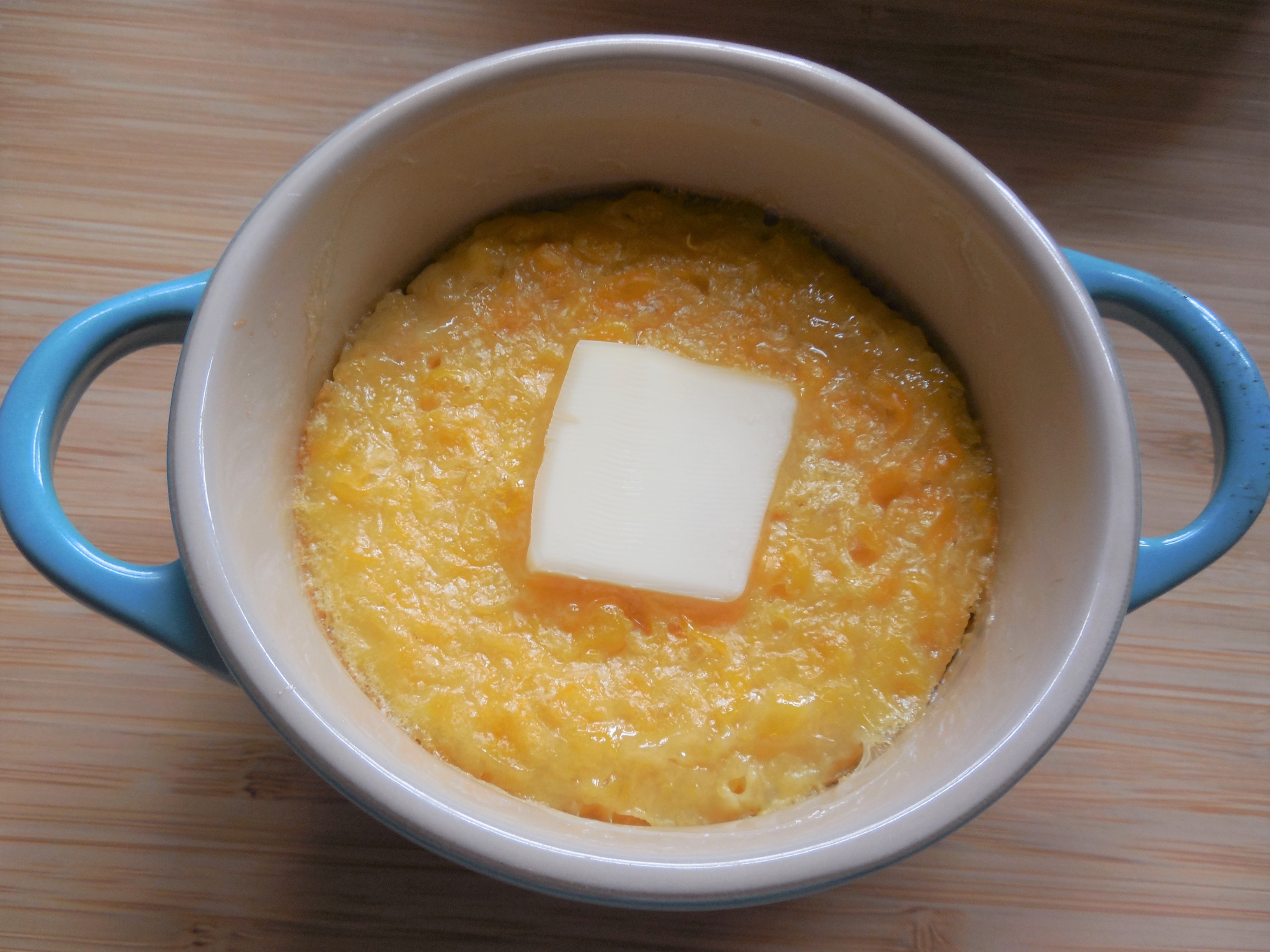 Top with a few pats of butter and eat. I made the large dish for family dinner tomorrow night, and the small one for myself, right now. I eat the whole thing immediately.