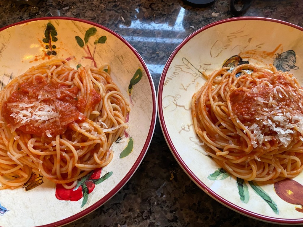 It’s a pretty standard pomodoro. I steeped the basil in oil. I added the whole garlic cloves and let them get a little color, then removed all but two, rook out the spent basil, and blitzed it with an immersion blender. (Important – ten cloves of garlic is too many for two cans of tomatoes. And I love garlic.) Carmy the main character, beautifully portrayed by Jeremy Allen White (Lip from Shameless), also halves an onion and simmers it in the sauce, then presumably removes it for serving à la Marcella Hazan. I also peep some crushed red pepper and butter.