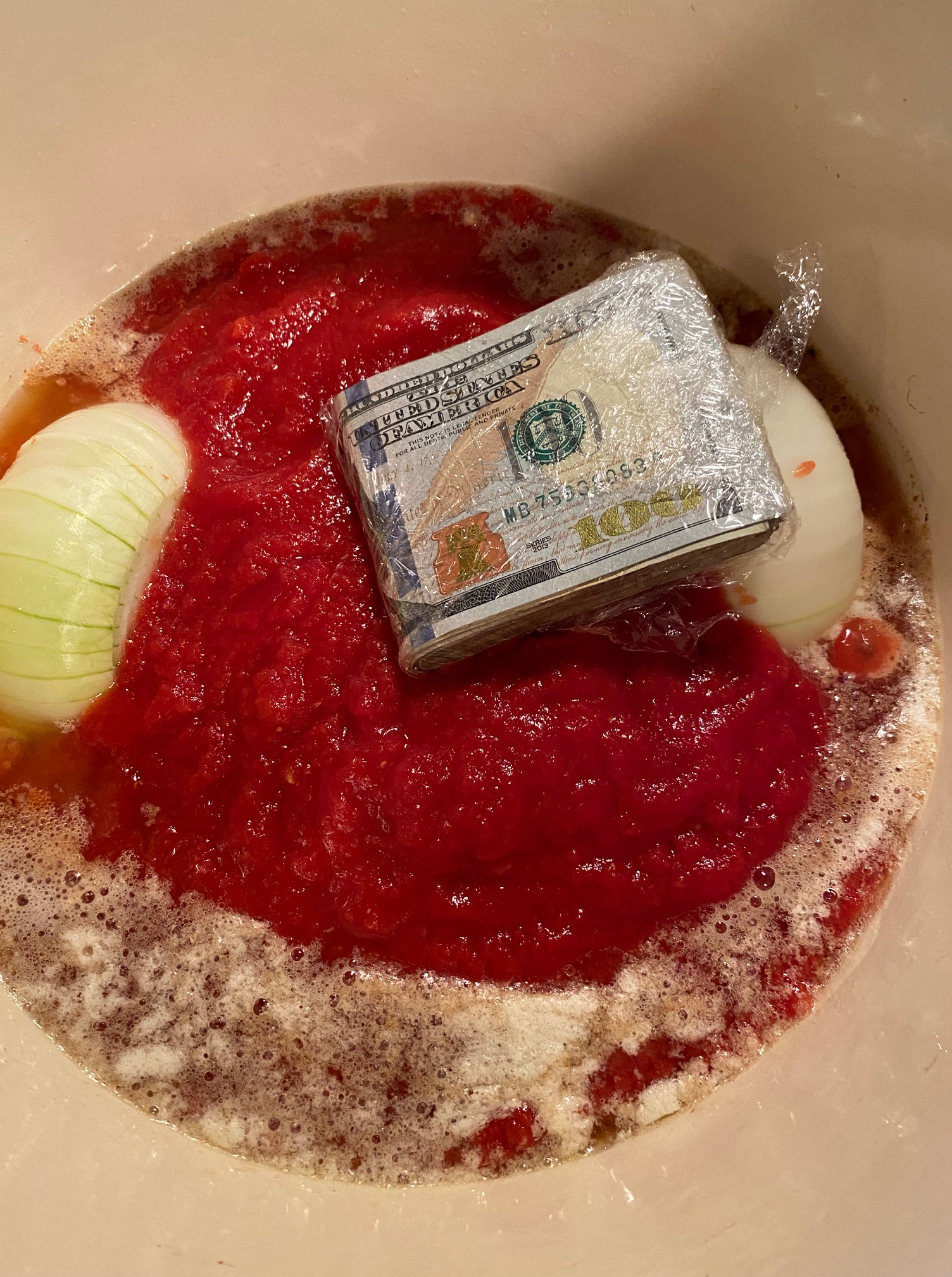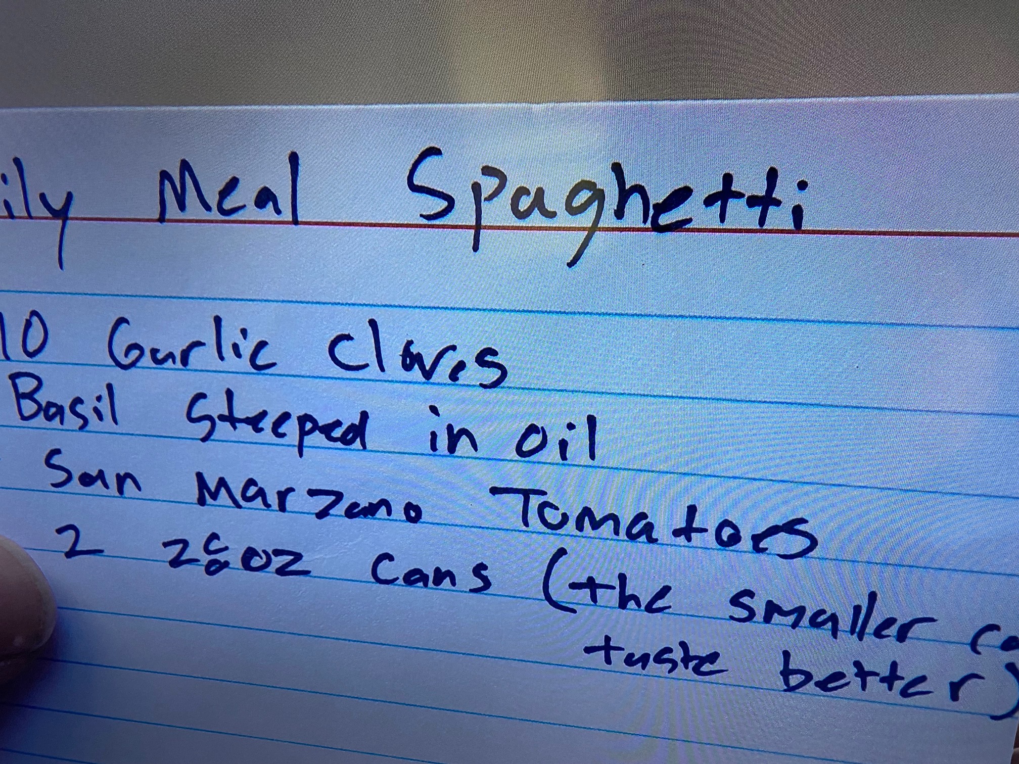 - 2 28 oz. cans San Marzano Tomatoes (crushed) with the note “The smaller cans taste better.”